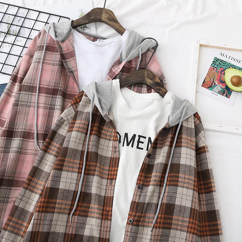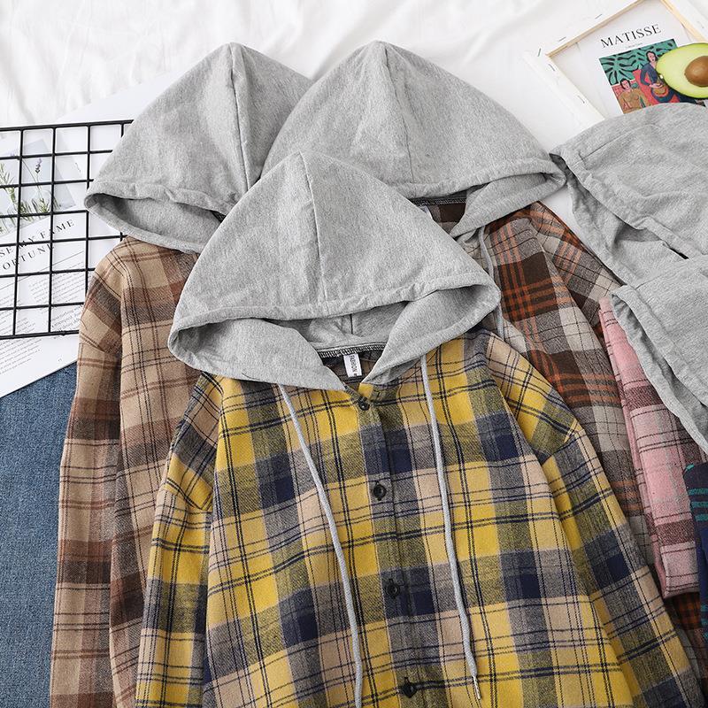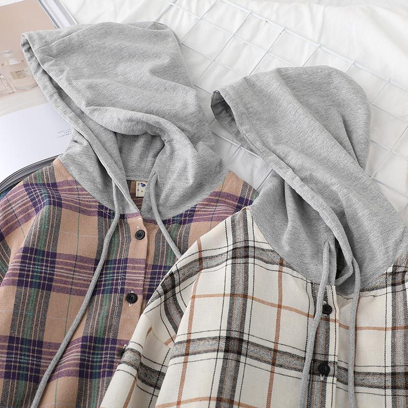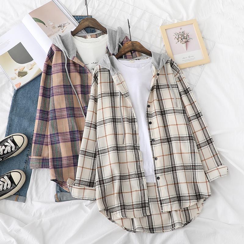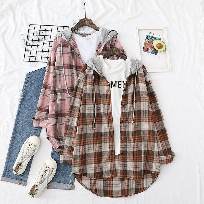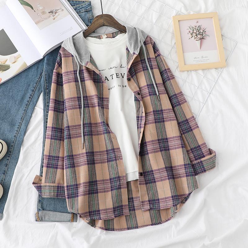 Retro Hong Kong Style Springsummer Autumn Plaid Shirt Women's Loose And Hooded Cardigan Coat