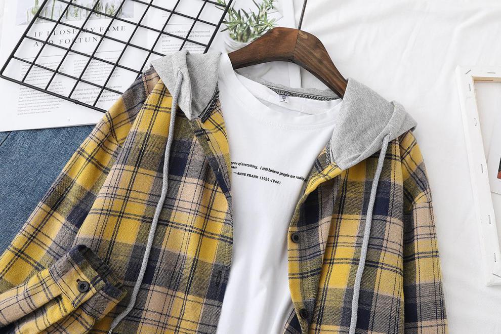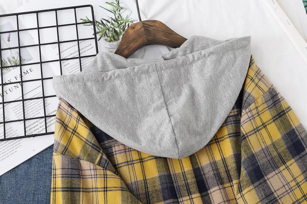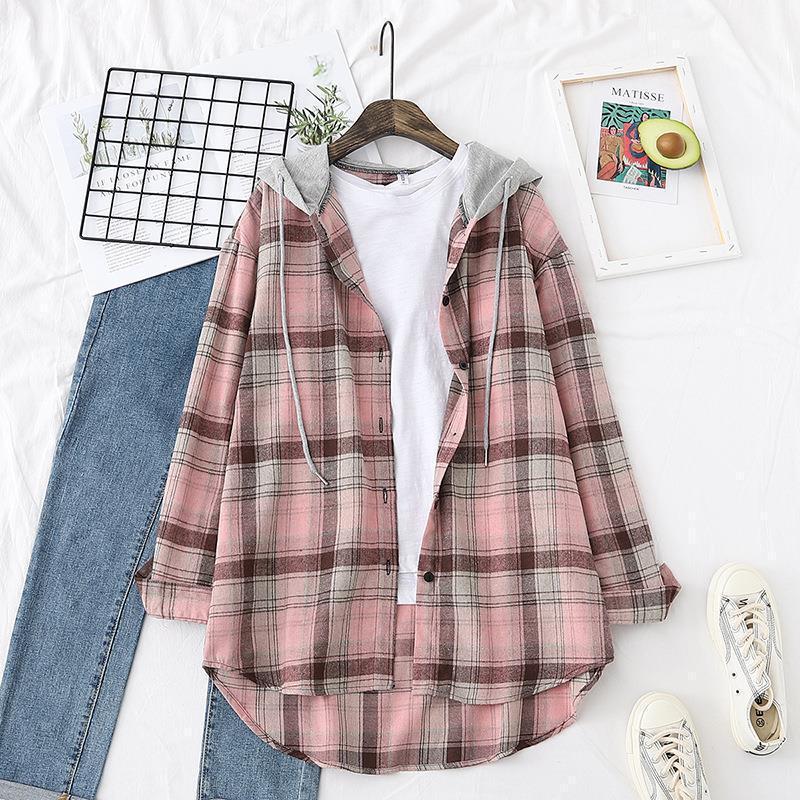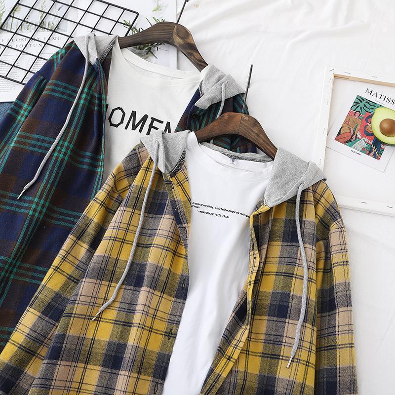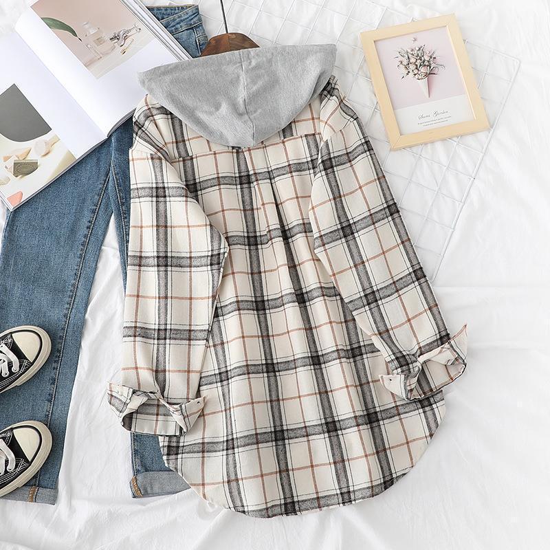 Retro Hong Kong Style Springsummer Autumn Plaid Shirt Women's Loose And Hooded Cardigan Coat